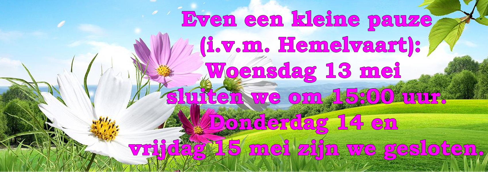 Wij zijn geopend op dinsdag, woensdag & donderdag van 9.00 tot 12.00 uur en van 13.30 tot 17.00 uur. Vrijdag zijn wij open van 9.00 tot 12.00 uur. Woensdag 13 mei sluiten we om 15:00 uur. 14 & 15 mei zijn we gesloten. Daarna helpen we je weer graag!