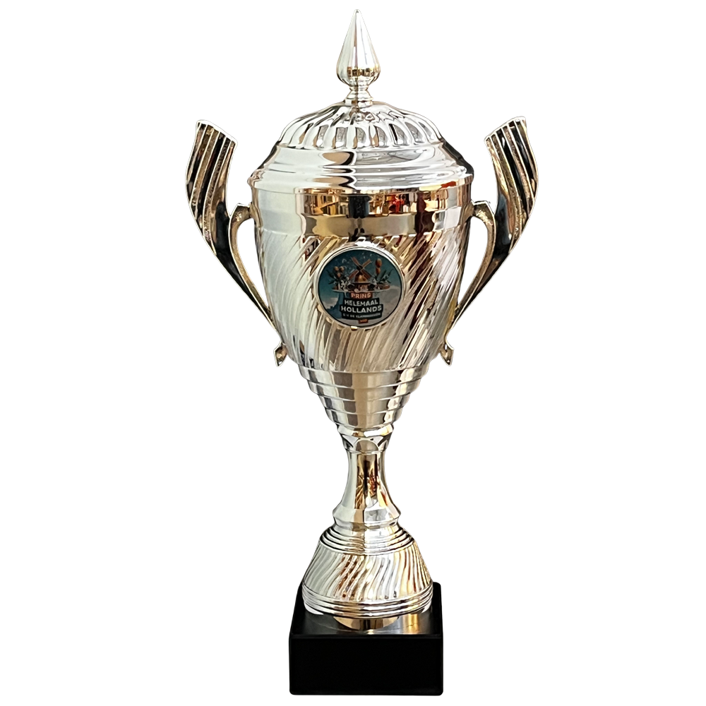 Op de beker zit een deksel welke vast gemonteerd zit aan de beker. in het midden van de cup kunnen wij een sport afbeelding of uw eigen afbeelding/logo monteren.