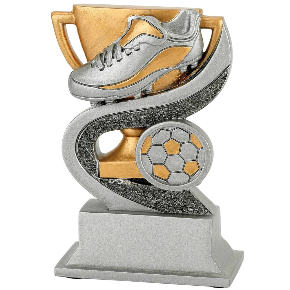 Sportprijs Almelo is een leuke voetbalstandaard in de kleuren zilver, grijs en goud. Op de standaard zijn een schoen en een beker afgebeeld.